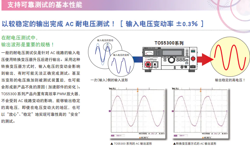一般的耐電壓測試儀是針對AC線路的輸入電壓轉換(huàn)變(biàn)壓器升(shēng)壓後進(jìn)行輸出(chū) 。採用這種轉換(huàn)變(biàn)壓器方式時 ,輸入電壓的變(biàn)動會影響到輸出(chū),有時可(kě)能無法(fǎ)正確完成(chéng)測試 。甚至(zhì)當(dāng)變(biàn)形的電壓施加到被測試裝置後 ,也可(kě)能會形成(chéng)新產品**的原(yuán)因(加速部件的劣化)。TOS5300系列產品內置由高效(xiào)率PWM放大(dà)器 ,不會受到AC線路變(biàn)動的影響 ,能夠輸出(chū)穩定的高電壓 ,即(jí)使在電壓變(biàn)動大(dà)的地區(qū),也可(kě)以放心(xīn),穩定的實現可(kě)靠(kào)性(xìng)高的**測試。