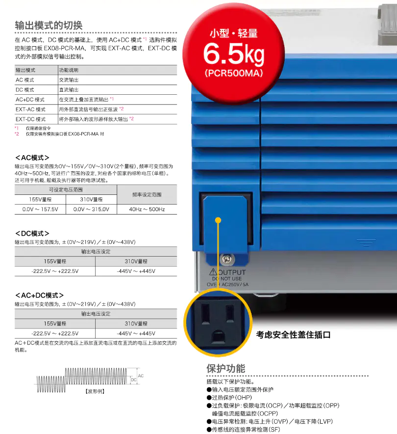 輸出模(mó)式切換:在AC模(mó)式,DC模(mó)式的基礎上,使(shǐ)用AC+DC模(mó)式*¹選(xuǎn)購件模(mó)擬控制接口(kǒu)板EX08-PCR-MA ,可實現EXT-AC模(mó)式,EXT-DC模(mó)式的外(wài)部模(mó)擬信號輸出控制 。