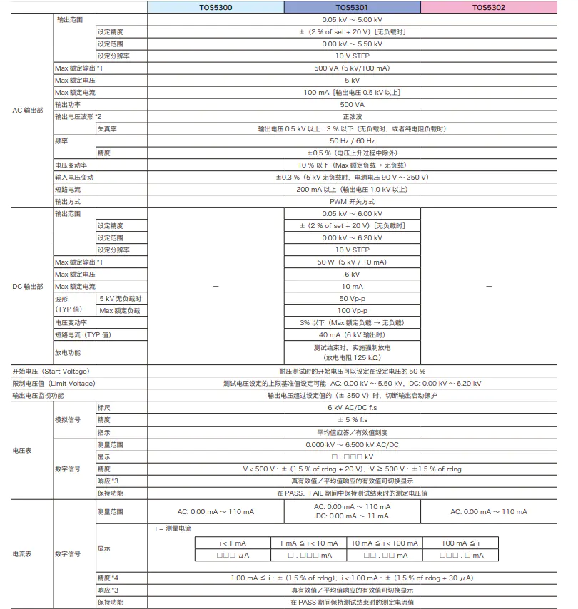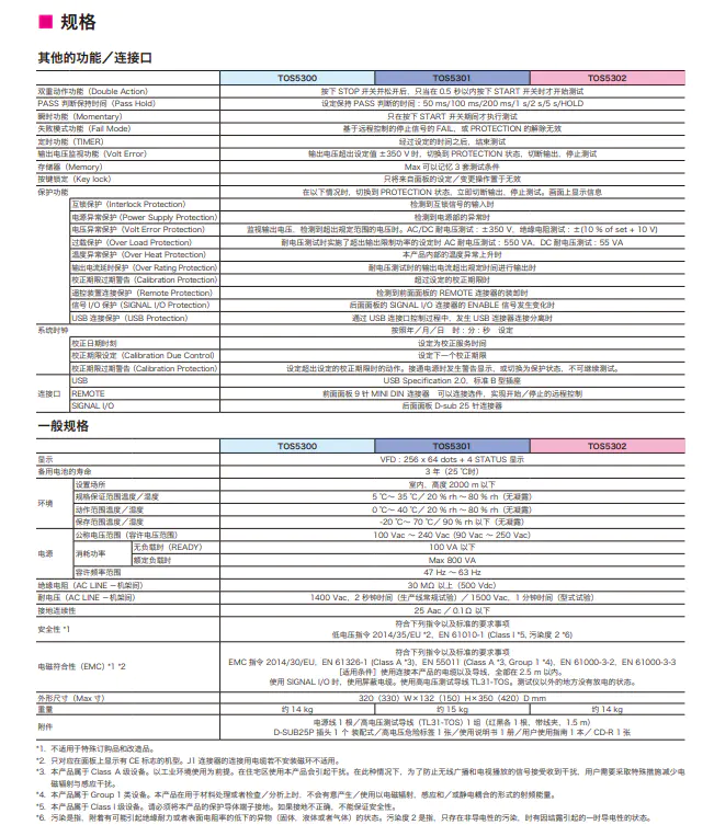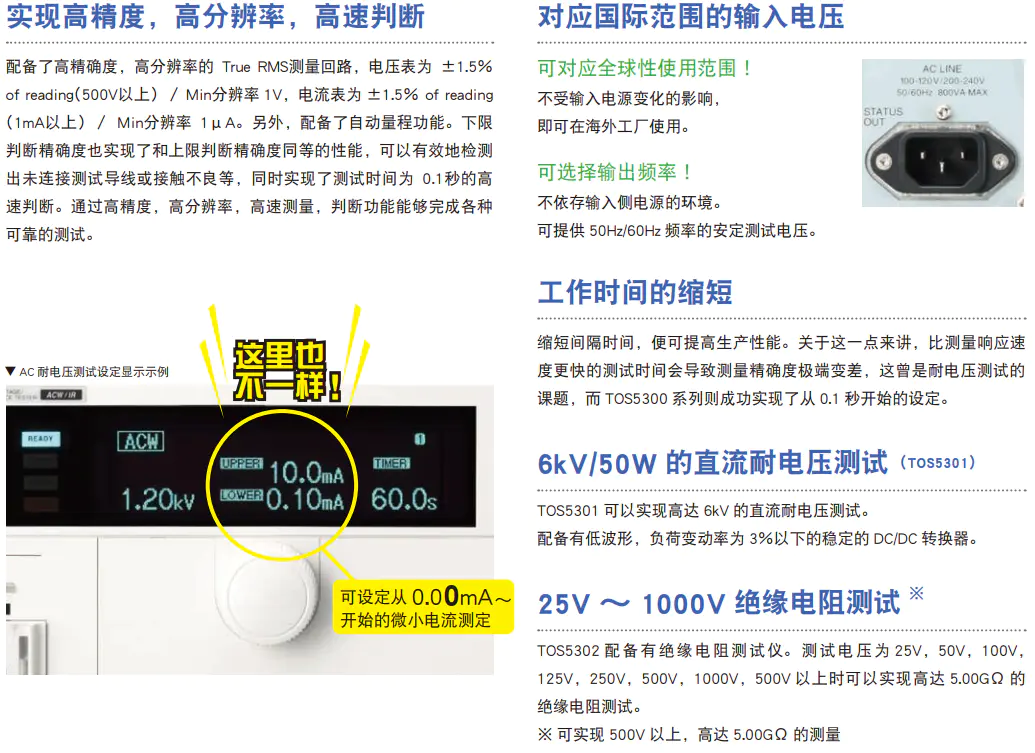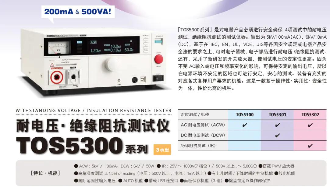 TOS5300系列是對電器產品必須進(jìn)行**確保4項測試中的耐電壓測試,絕緣阻(zǔ)抗測試的測試儀器。輸出(chū)為5kV/100mA(AC) ,6kV/10mA(DC) ,基於(yú)在IEC ,EN,UL ,VDE ,JIS等各國**規定或電器產品**法(fǎ)的要求之(zhī)上(shàng) ,可(kě)對電子器械(xiè) ,電子部品進(jìn)行耐電壓/絕緣阻(zǔ)抗測試 。還有 ,採用了新研發的開關放大(dà)器,使測試電壓的穩定性(xìng)更高。因為不受AC輸入端電壓和頻率變(biàn)化的影響,可(kě)保持穩定的輸出(chū)電壓,所以在電源(yuán)環(huán)境不穩定的區(qū)域也可(kě)進(jìn)行穩定 ,安心(xīn)的測試。同時還具備了可(kě)對應各式各樣客戶要求的各種功能 。TOS5300系列是一款基於(yú)操作性(xìng)・實用性(xìng)・**性(xìng)為一體的機型 。